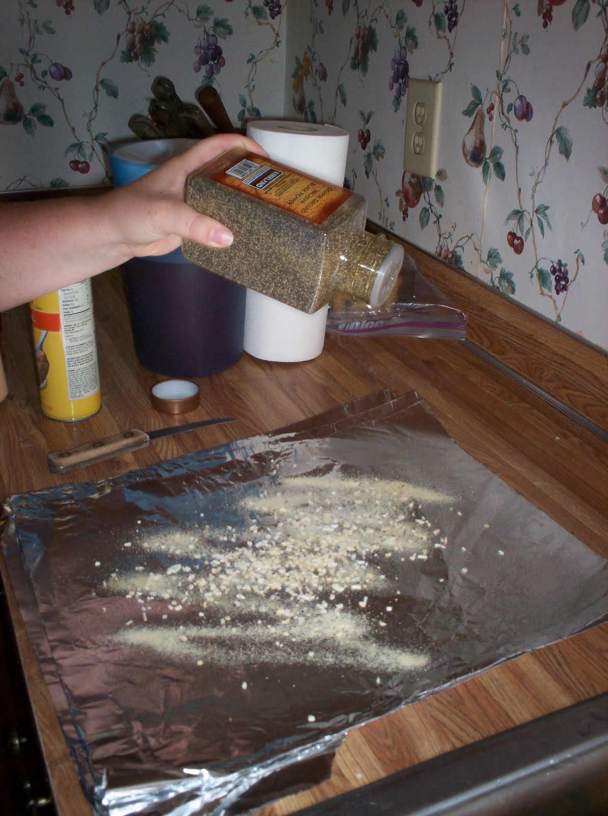 First, I took a tub of butter and coated each potato in it. (Now I just spray the aluminum with PAM.) Then, I took garlic powder, onion powder, salt and pepper and I sprinkled the skins with each (PAM helps the spices stick). Then I baked like normal. The outcome was a delectable finish to any potato. Now we don't have to pull those teeth to get anyone to eat their skins.